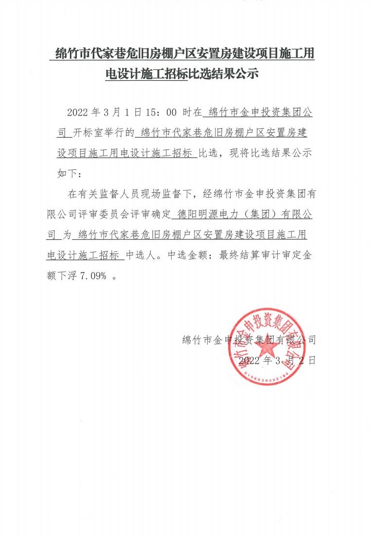 綿竹市代家巷建設項目施工用電設計施工招標比選結果公示