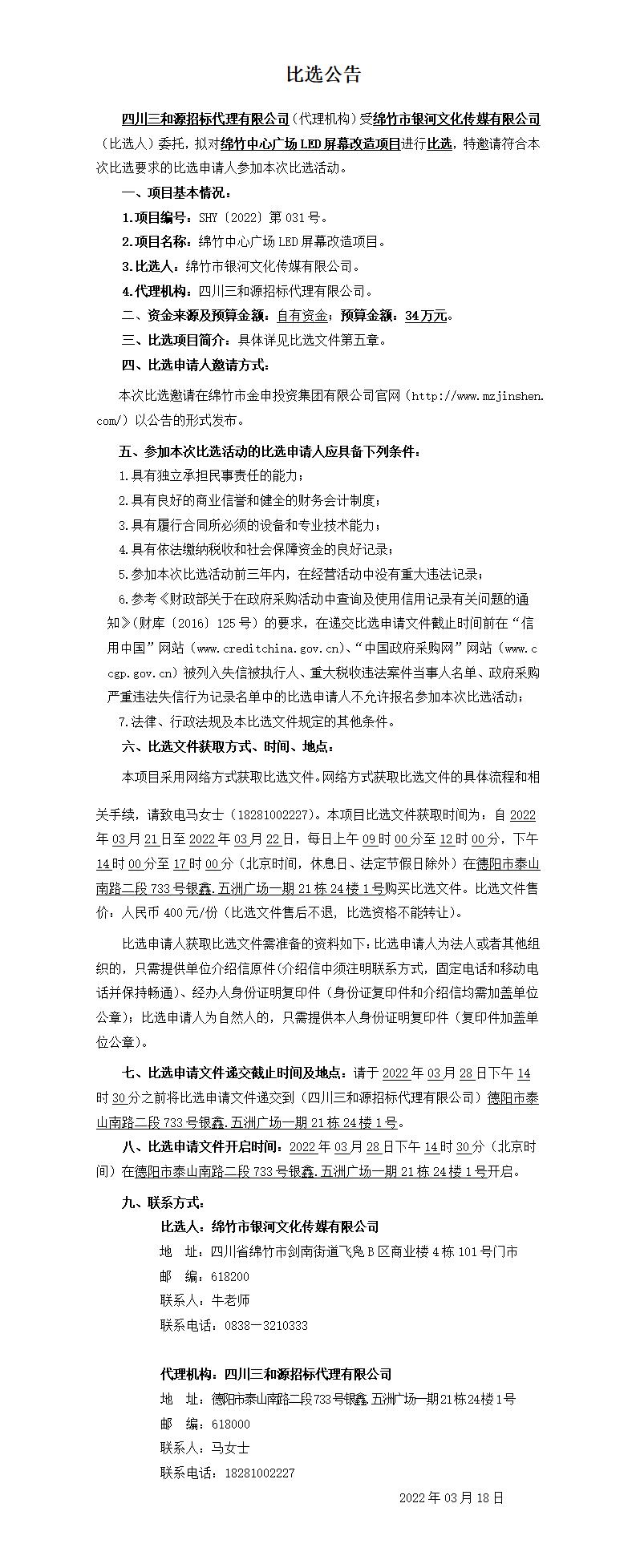 綿竹中心廣場(chǎng)LED屏幕改造項目比選公告
