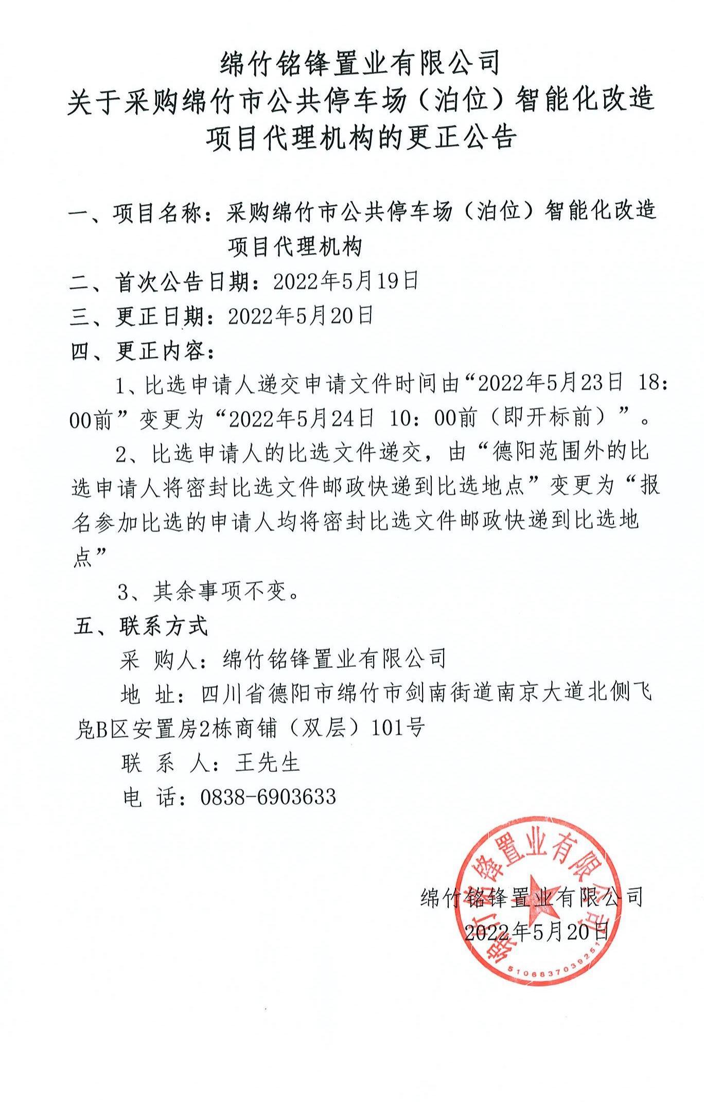綿竹市公共停車(chē)場(chǎng)(泊位)智能改造代理機構比選更正公告