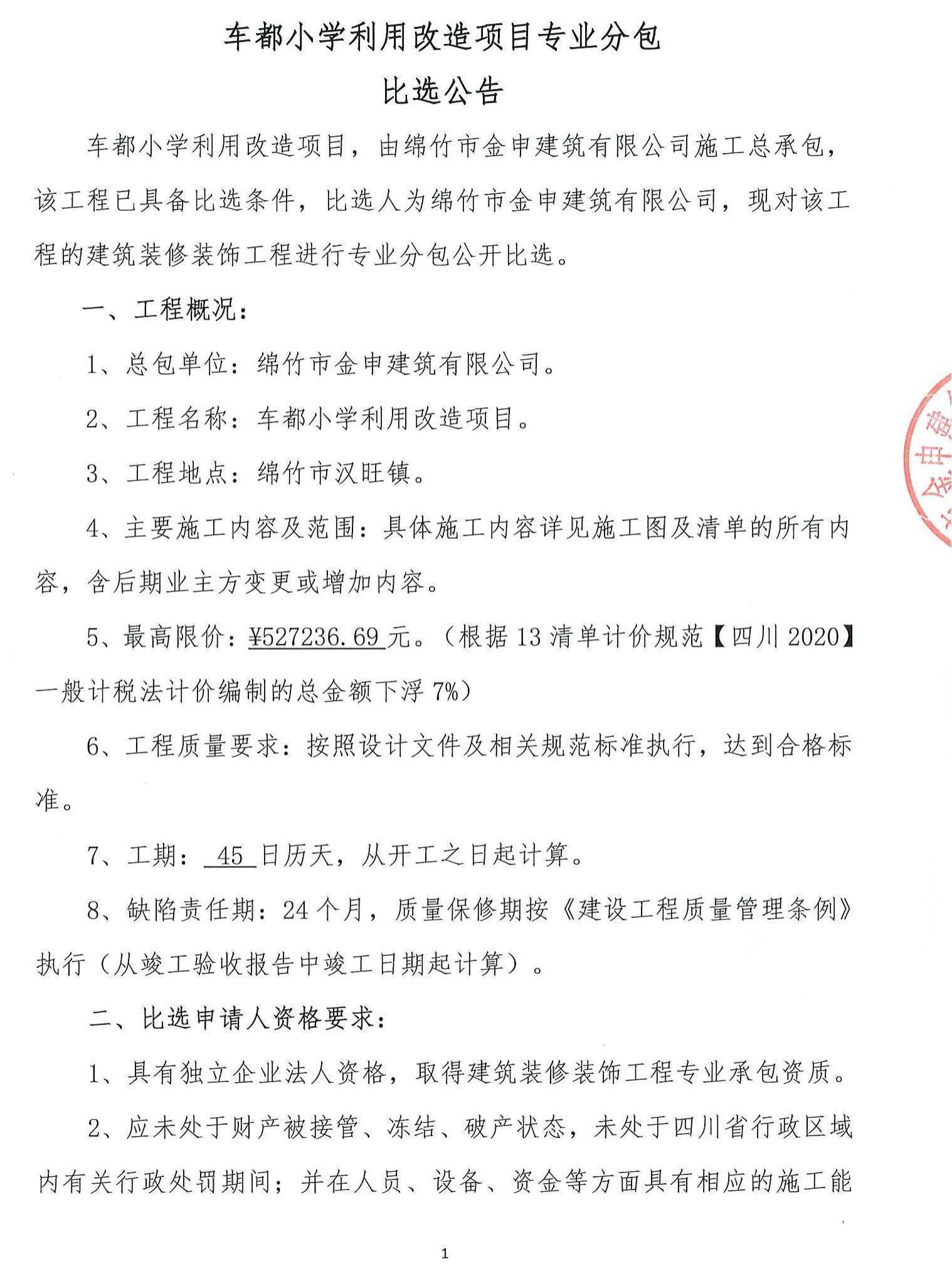 車(chē)都小學(xué)利用改造項目專(zhuān)業(yè)分包比選公告