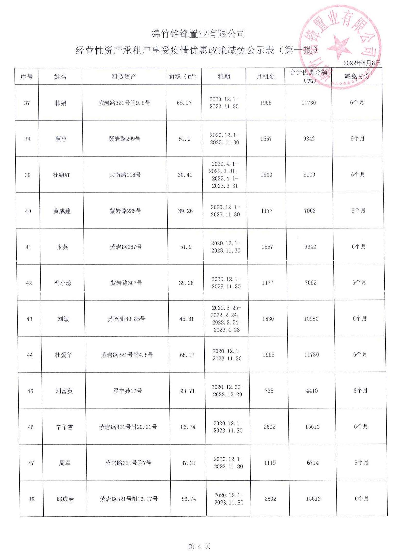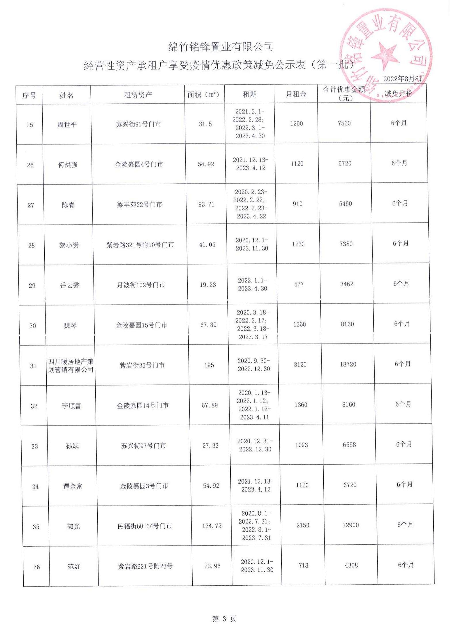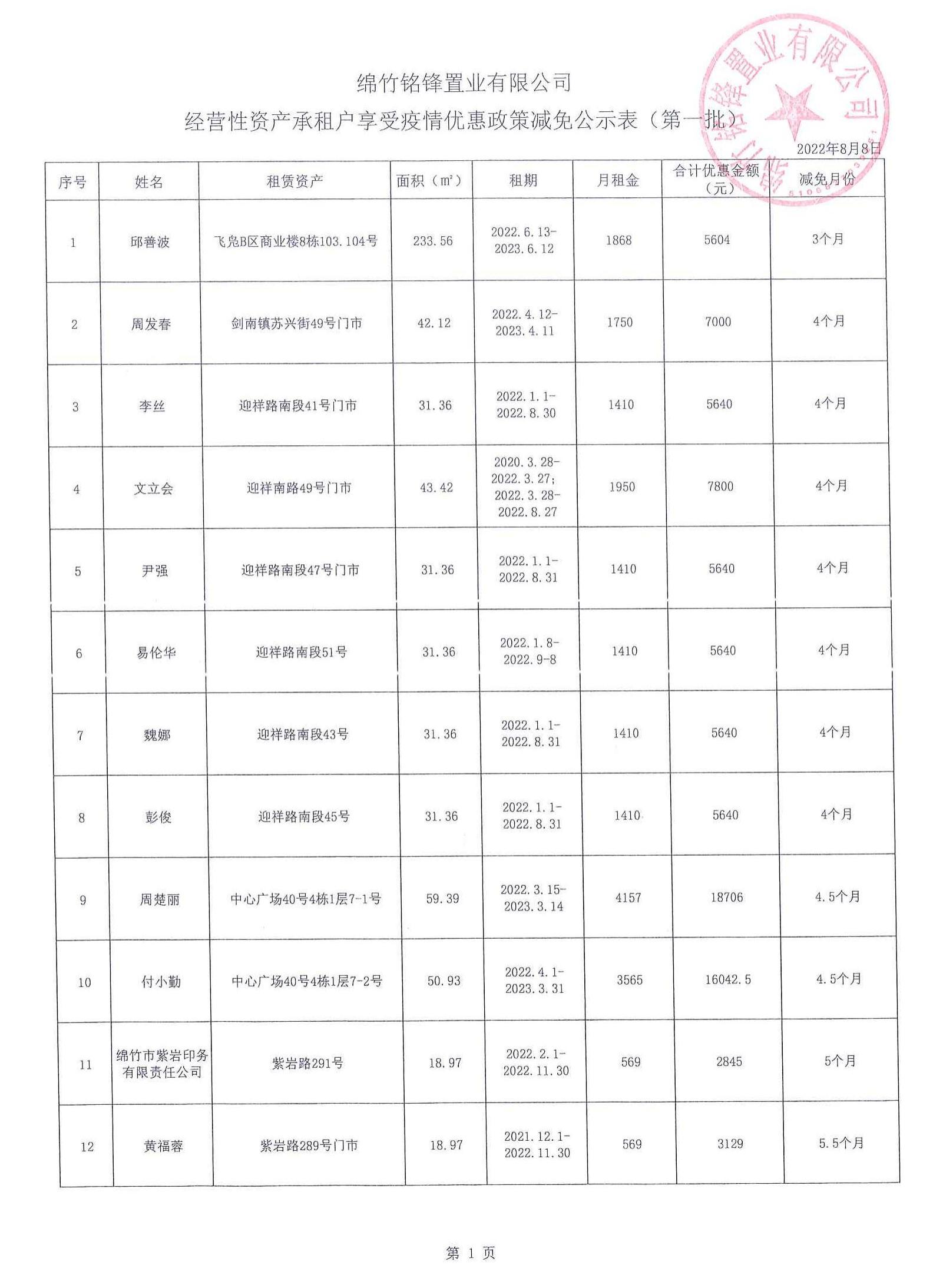 經(jīng)營(yíng)性資產(chǎn)承租戶(hù)享受疫情優(yōu)惠政策減免公示表(第一批)
